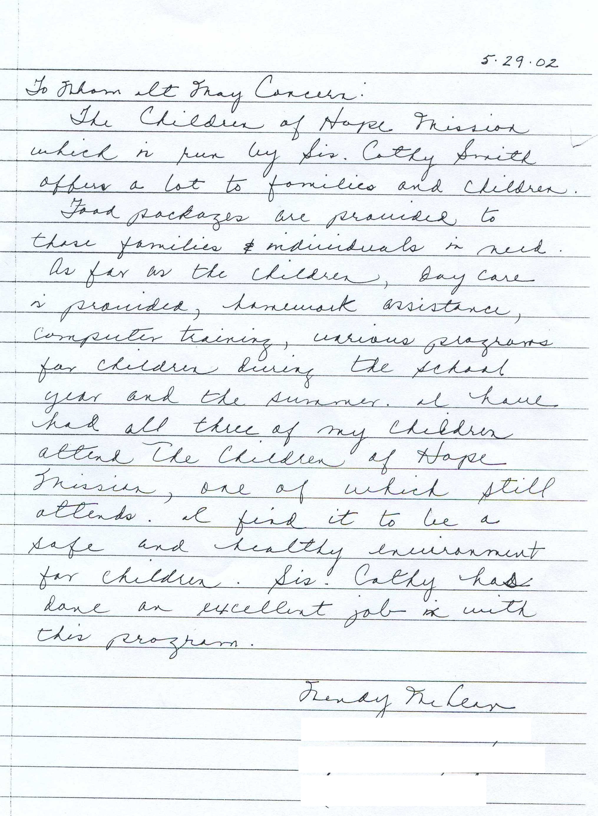 One great thing about Sister Cathy was that she always put education first. As a result we became honor roll students many times. As soon as we got home from school, she made sure we finished our homework before doing anything else. She also checked over our homework to make sure it was impeccable. She disciplined and developed us in a way our parents never could, and it worked. She did everything she needed to do for us, and more. We always had great health as we regularly went to the doctor. The things she taught us that we remember and value today were to stay out of trouble, to do great in school, and most importantly she taught us about Jesus. Along our journey, we have met some great people. People like Dr. John Cottone, Dr. Dave McClean, Mr. Seymour and his family, and countless others who have helped us and Sister Cathy, and still continue to do so. During the holidays, we would visit their families and have great times. We finally came back to live with our family in Florida in June 2010. We have had many great memories with Sister Cathy and our friends, and hopefully many more. Without Sister Cathy’s massive positive impact in our lives, we could be in a foster home right now. Sister Cathy and our friends, like Dr. Cottone, still help us out a lot, and we still keep in touch. If it wasn’t for Sister Cathy, we wouldn’t be where we are today.